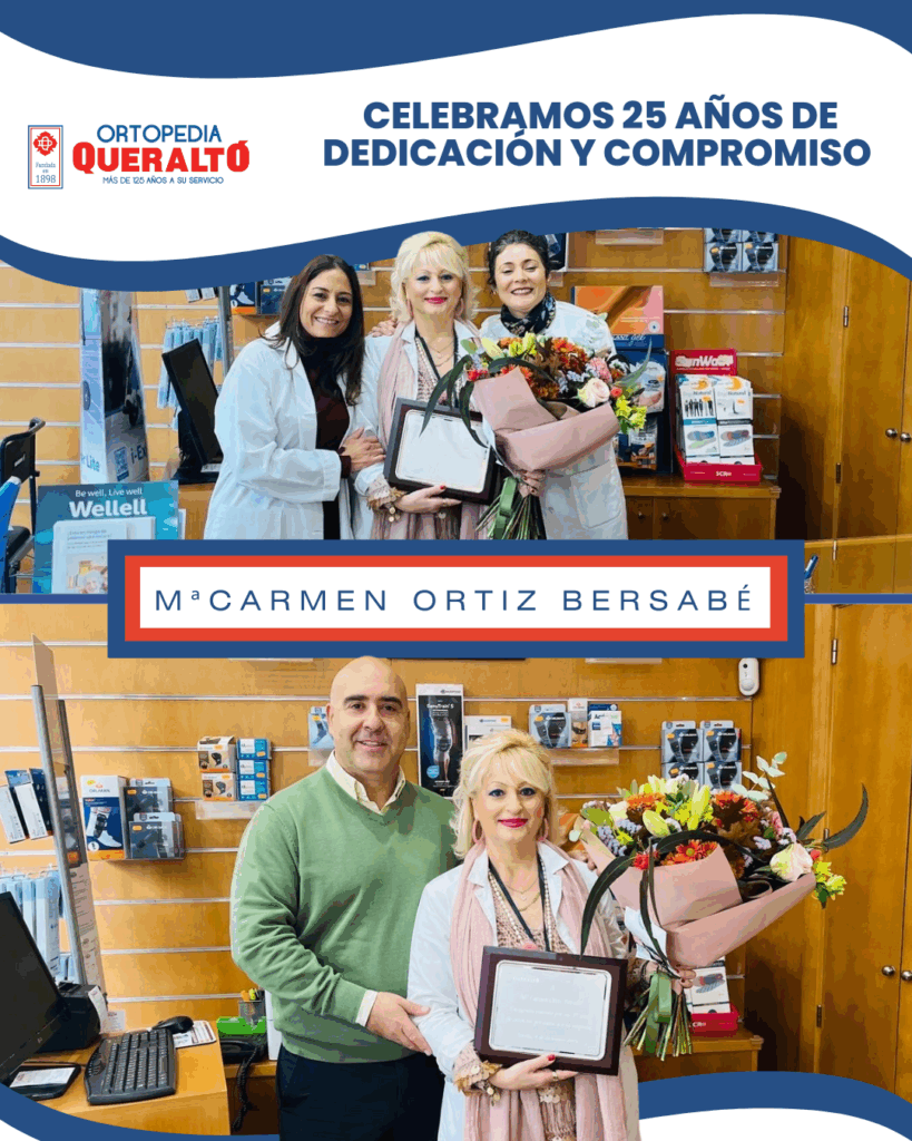 Ortopedia Queraltó celebra el 25º aniversario profesional de Remedios Gustos Palacios En Ortopedia Queraltó hemos tenido el honor de celebrar un hito muy especial para nuestra organización: el aniversario profesional de nuestra compañera Remedios Gustos Palacios, quien cumple 25 años de trayectoria impecable en nuestra sucursal de Huelva. Una trayectoria de compromiso en Huelva A lo largo de su trayectoria, Remedios ha destacado por su cercanía en el trato, su vocación de servicio y su implicación constante con cada persona a la que atiende. Durante este cuarto de siglo, se ha convertido en un referente tanto para sus compañeros como para nuestros clientes en el sector de la ortopedia y el bienestar. Su recorrido representa fielmente los valores que definen a nuestra empresa: Compromiso: Con la salud y mejora de la calidad de vida de los pacientes. Constancia: 25 años de evolución constante junto a la marca. Calidad humana: Empatía y profesionalidad en cada consulta. Reconocimiento a su aniversario profesional y dedicación Como reconocimiento a su excelente labor, Don José Queraltó le hizo entrega de una placa conmemorativa en un acto emotivo. Durante el evento, se puso en valor su aportación y la influencia positiva que ha tenido en la empresa desde su incorporación, reforzando nuestro liderazgo como ortopedia de confianza. Desde Ortopedia Queraltó queremos transmitir a Remedios nuestro más sincero agradecimiento. Este aniversario profesional no es solo una cifra, sino el reflejo de una dedicación que es parte esencial de la calidad del servicio que ofrecemos cada día a nuestros usuarios. «Gracias, Remedios, por formar parte de nuestra historia y por acompañarnos con tu profesionalidad durante estos 25 años.» Si deseas conocer más sobre nuestro equipo o visitar nuestra red de sucursales, no dudes en contactar con nosotros. Seguimos trabajando para ofrecerte las mejores soluciones en movilidad y salud.