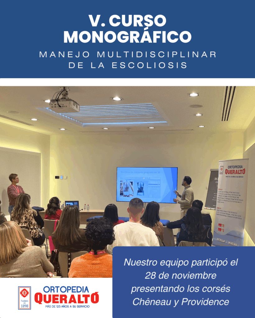 El pasado 28 de noviembre de 2025, Ortopedia Queraltó tuvo el honor de participar y colaborar en el V Curso Monográfico “Manejo Multidisciplinar de la Escoliosis”, donde se presentaron los corsés Chêneau y Providence. Queremos destacar especialmente la labor de nuestro técnico David Muñoz, quien impartió los talleres de formación sobre ambos corsés. David es un profesional de referencia en el ámbito de la escoliosis, con una amplia trayectoria, sólida experiencia clínica y un alto nivel de especialización, lo que aportó un valor añadido excepcional a la formación y fue muy apreciado por todos los asistentes. La formación se desarrolló en una ponencia conjunta con: Asimismo, queremos expresar nuestro agradecimiento al Dr. Jorge Rodríguez García, director del curso, por su excelente organización y coordinación, que contribuyeron al éxito del evento. La combinación de conocimientos, experiencia y especialización convirtió esta formación en una oportunidad única y de gran valor para todos los asistentes, reforzando nuestro compromiso con la excelencia y la innovación en ortopedia.